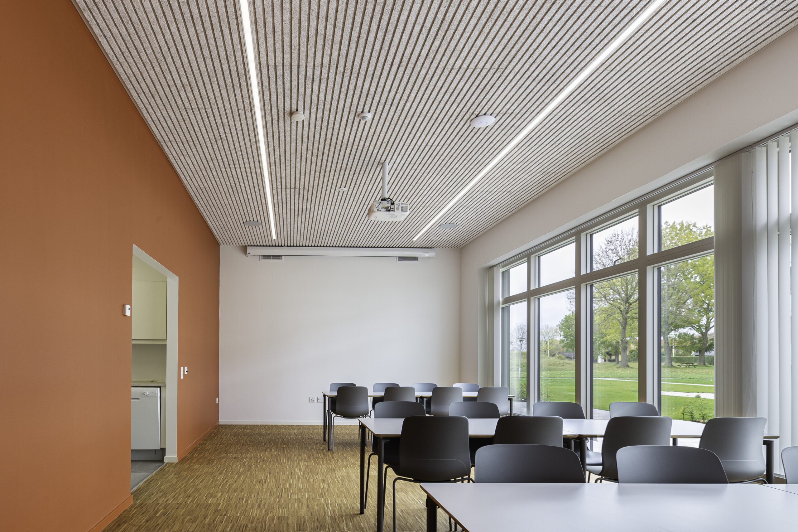 Det nybyggede fælleshus i boligområdet Skanseparken (Fredericia) har fået et sundt indeklima med designløsningen Troldtekt® line, hvor ventilation er integreret i loftfladen.